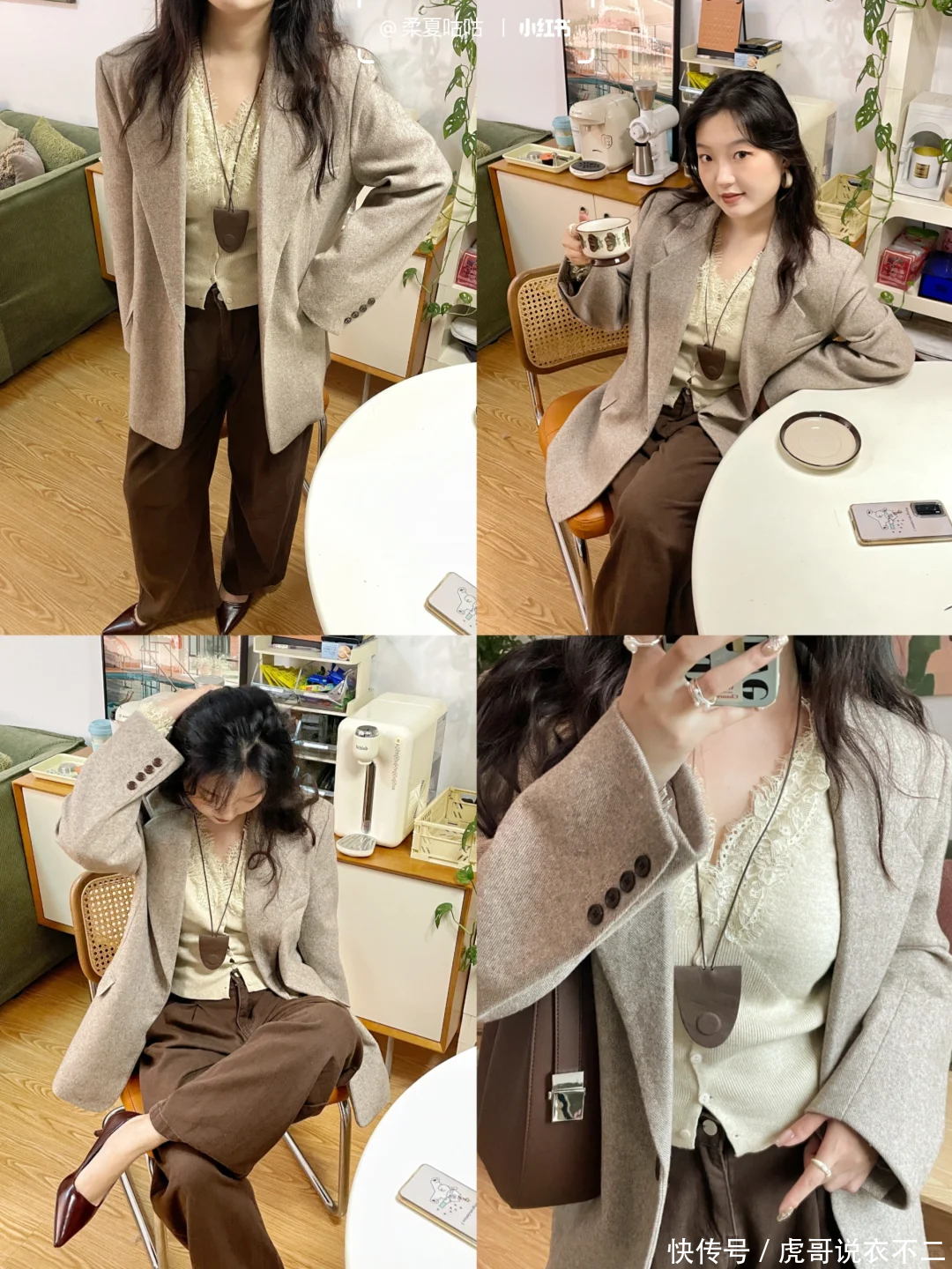 燕麦色的单品不仅适合日常穿着,也非常适合职场女性。比如,一款燕麦色的西装套装,既能够展现出女性的干练与利落,又不失温柔与优雅。无论是搭配高跟鞋还是平底鞋,都能轻松打造出既专业又时尚的造型。