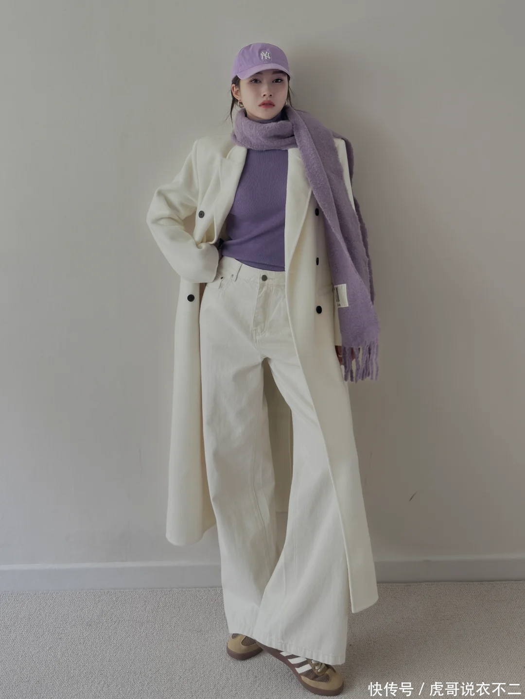 在配色方面,白色也极具包容性。你可以选择与各种颜色的内搭进行搭配,都能轻松打造出既和谐又时尚的造型。比如,一款白色的长大衣,内搭紫色的高领衫和白色的休闲阔腿裤,既浪漫又不失高级感。